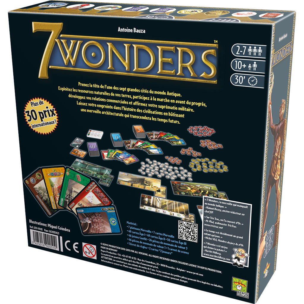 7 Wonders. Éditeur : Repos Prod / Référence : REP7W01FR / Ean : 5425016923764. 41,90 €. En stock. Quantité. Ajouter au panier. Derniers articles en stock. Lire ou écrire un avis. Prenez la tête de l'une des sept grandes cités du monde Antique. 7 Wonders est un grand classique unanimement salué et multi-récompensé.