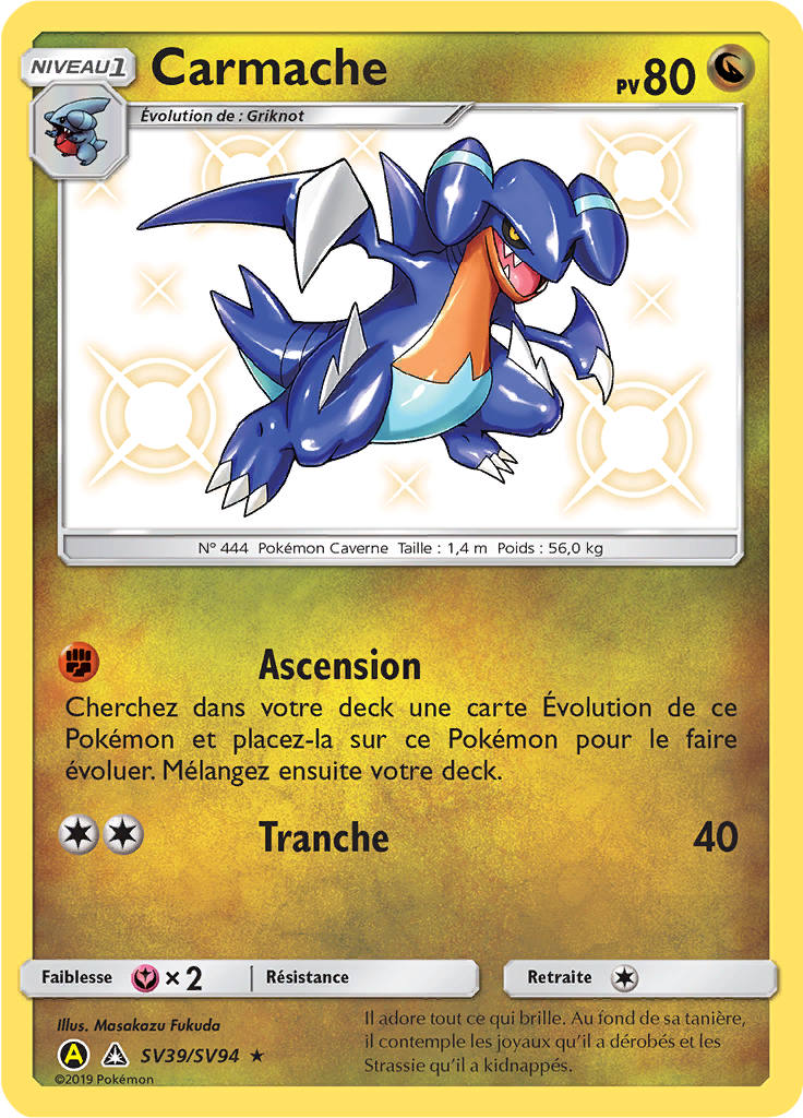 Fiche Pokédex de Carmache. Toutes les informations utiles sur le Pokémon : ses attaques, ses talents, ses statistiques, ses évolutions et où le capturer. Publié le 28 août 2019 à 19:34 - par Maafterchef. Partager : Carmache est un Pokémon de type Dragon / Sol apparu lors de la quatrième génération. 443 - Griknot.