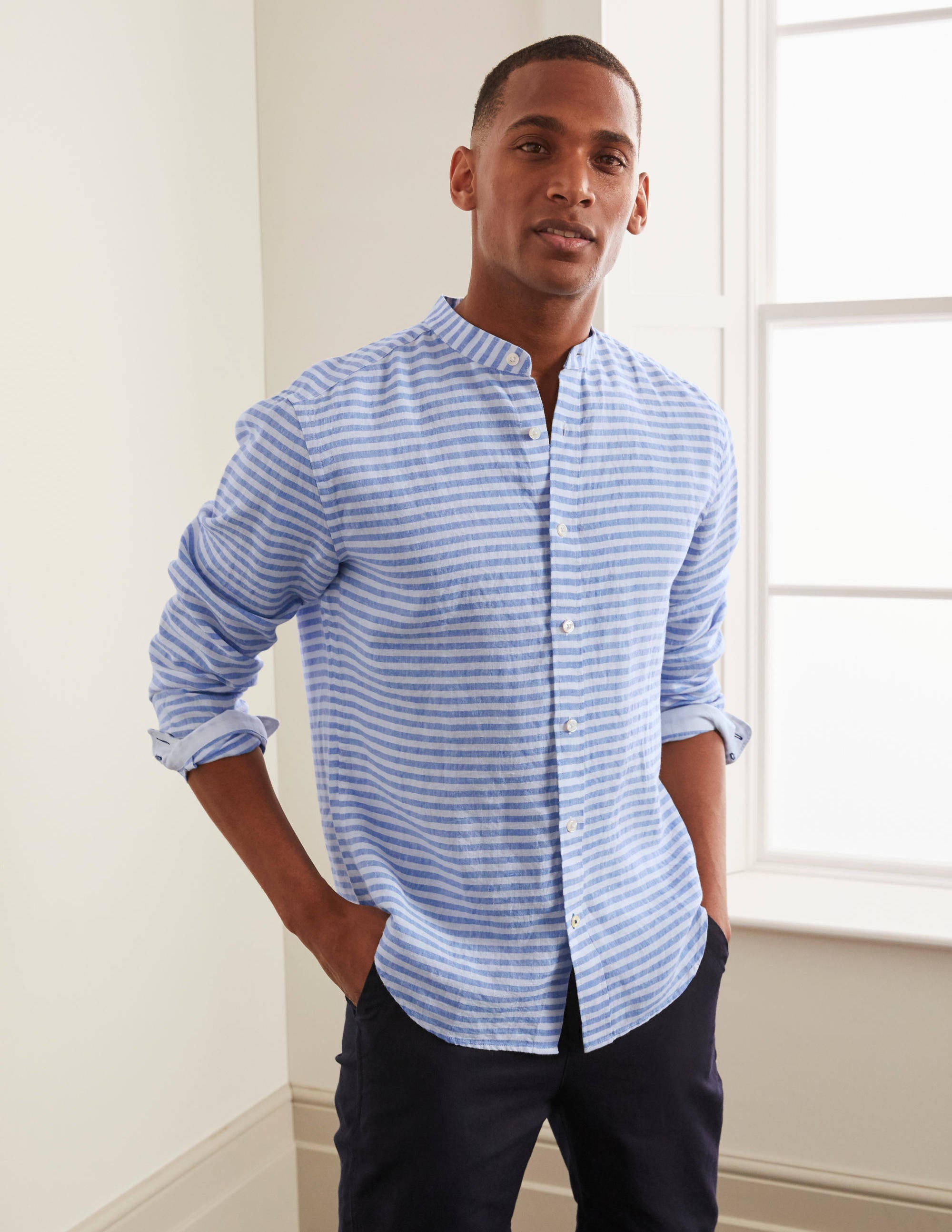 Chemises Homme Chemise En Lin À Col GrandPère Rayé Bleu Littoral Boden — Éveil du corps