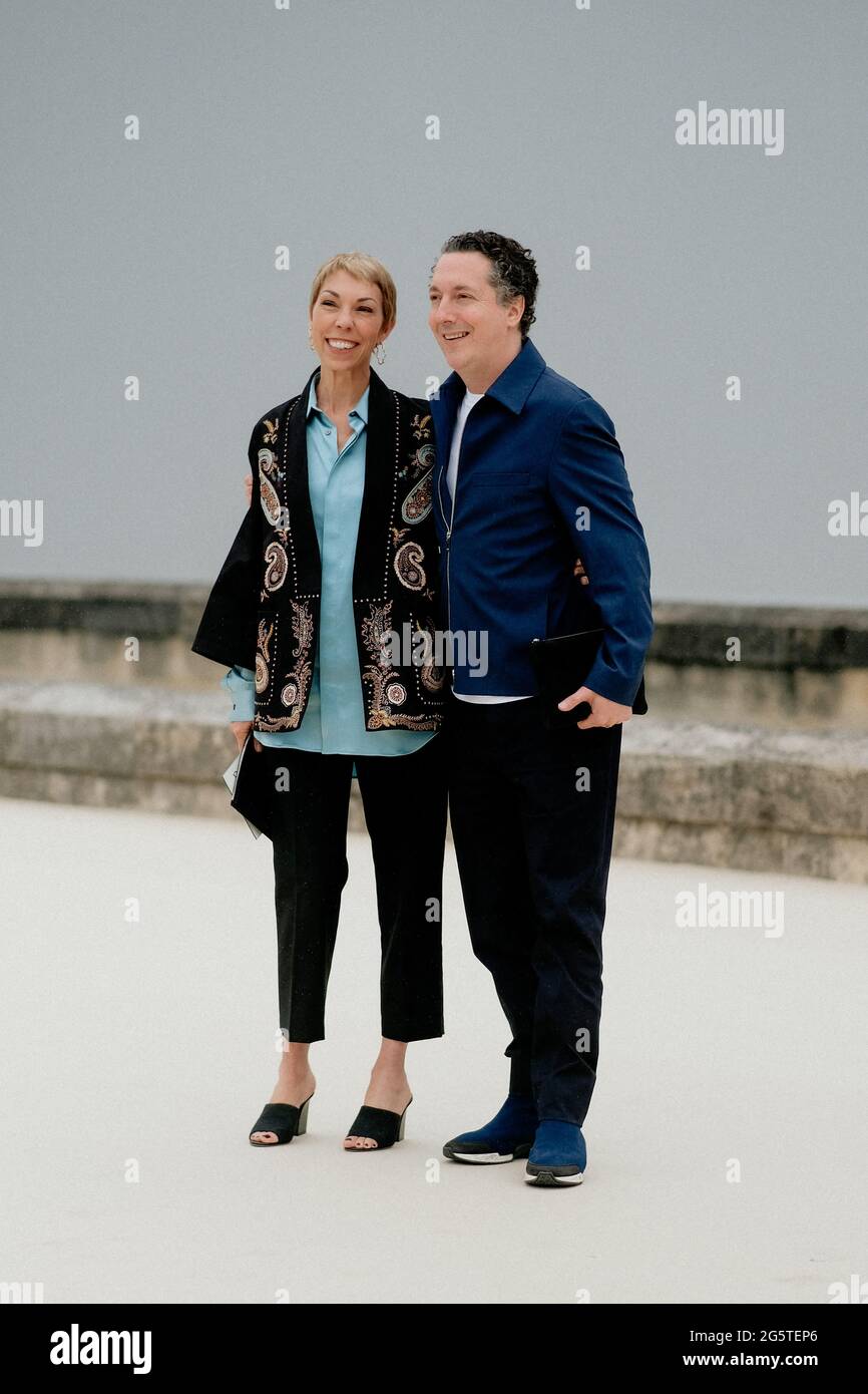 Street style, Mathilde Favier and Guillaume Gallienne arriving at Dior Spring Summer 2022