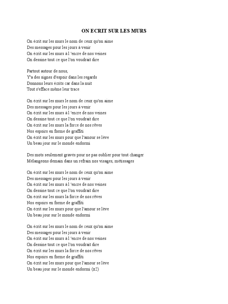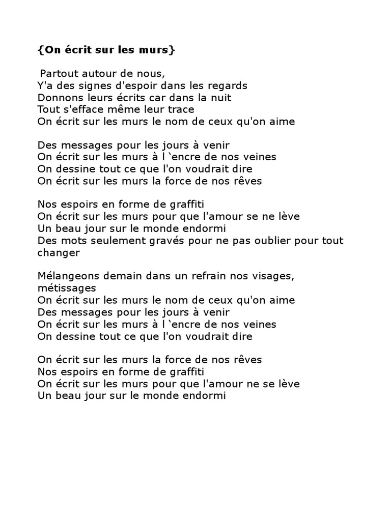 x 2. On écrit sur les murs le nom de ceux qu'on aime Des messages pour les jours à venir On écrit sur les murs à l 'encre de nos veines On dessine tout ce qu'on voudrait dire x 2. On écrit sur les murs la force de nos rêves Nos espoirs en forme de graffiti On écrit sur les murs pour que l'amour ne se lève Un beau jour sur le monde.