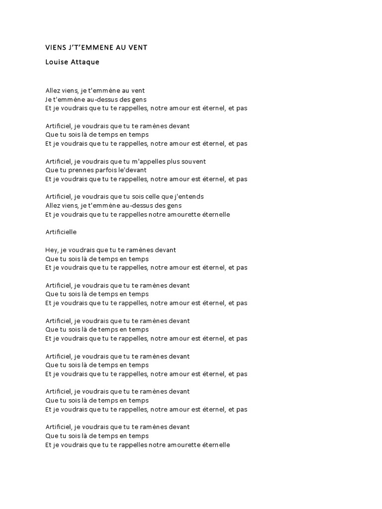 Louise Attaque Lyrics. "J't'emmène Au Vent". Allez viens, j't'emmène au vent. Je t'emmène au-dessus des gens. Et je voudrais que tu te rappelles. Notre amour est éternel. Et pas artificiel. Je voudrais que tu te ramènes devant. Que tu sois là de temps en temps.