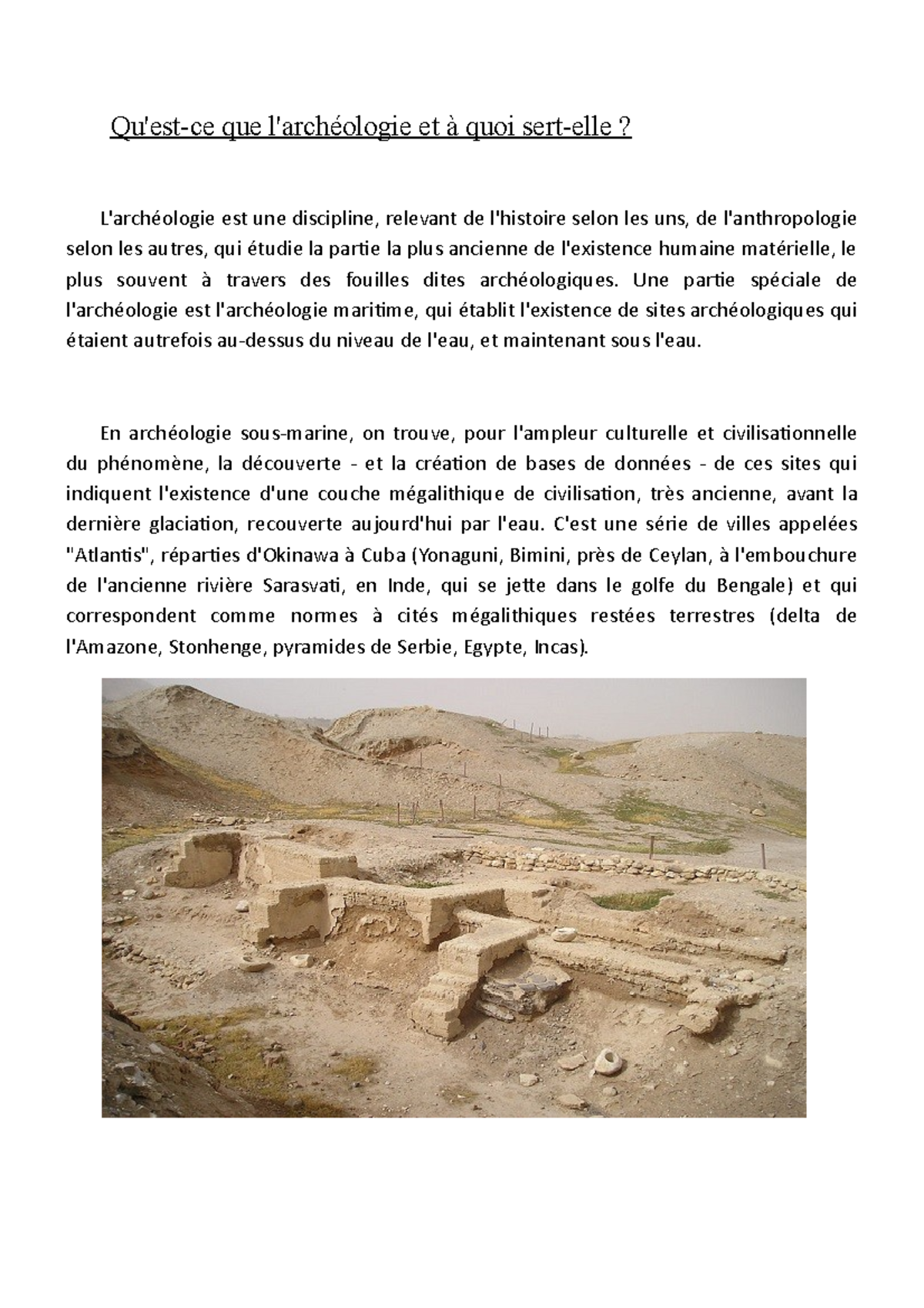 Qu'est-ce que l'archéologie ? L'archéologie est la discipline scientifique qui permet de reconstituer les sociétés du passé, aujourd'hui disparues, détruites par les catastrophes naturelles ou par l'acharnement des hommes, dont les vestiges abandonnés sont enfouis sous la sédimentation des ans. Certes nous possédons de nombreux textes historiques, philosophiques.
